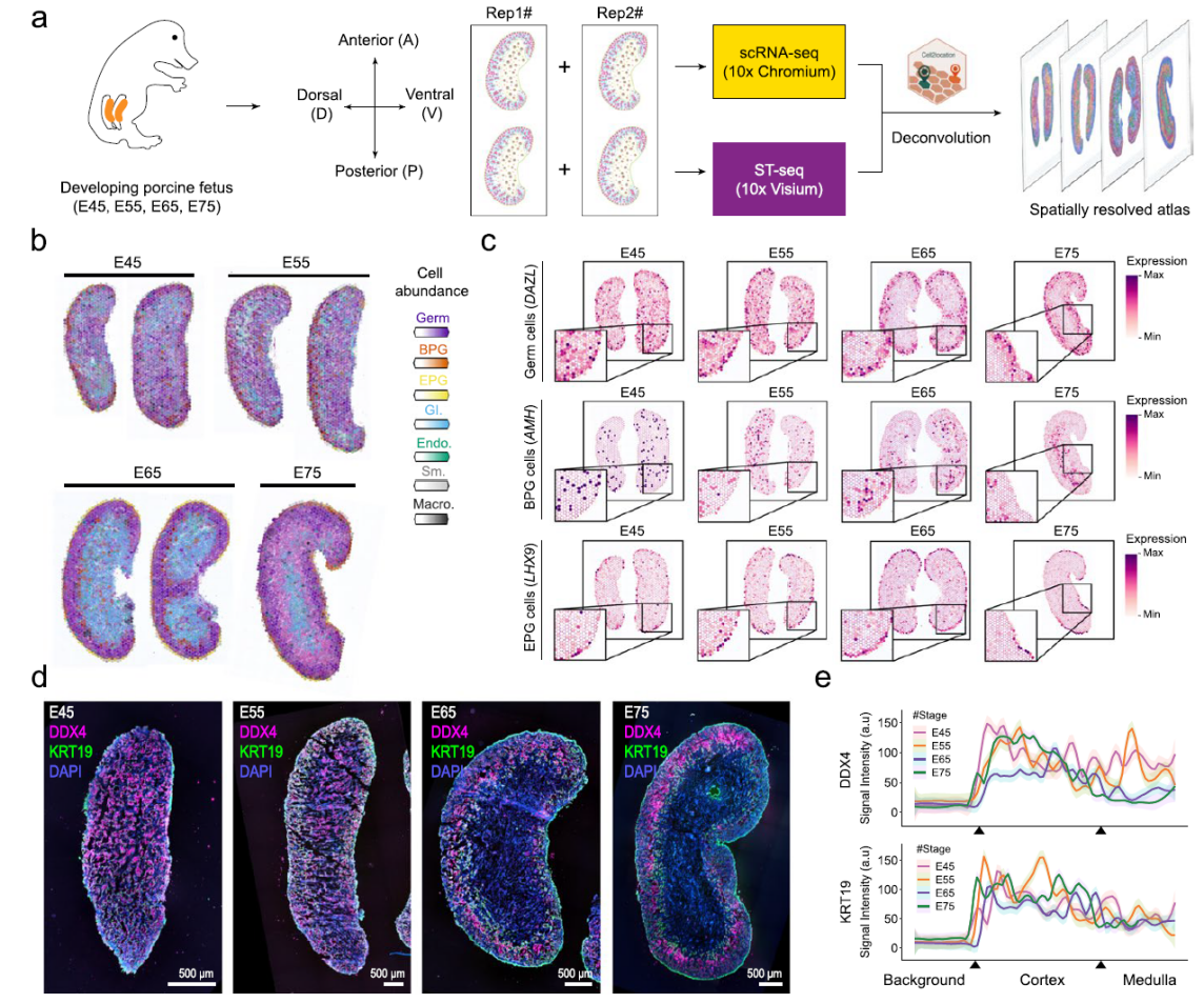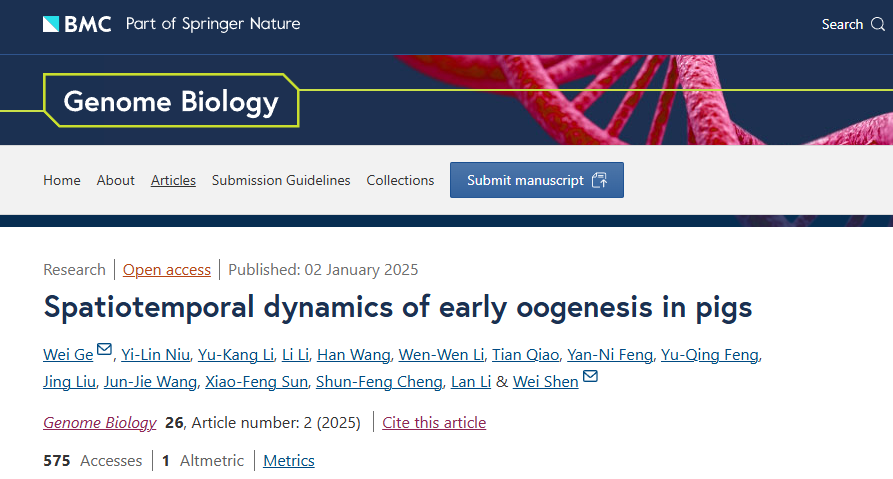 1月2日,国际基因组学领域权威学术期刊《Genome Biology》(IF 5-yr: 16.5)在线发表了beat365亚洲体育官方网站葛伟/沈伟教授课题组完成的题为“Spatiotemporal dynamics of early oogenesis in pigs”的研究论文。该研究借助单细胞RNA测序(scRNA-seq)以及空间组学技术,针对猪早期卵子发生阶段的4个时间点(E45、E55、E65以及E75),对7个卵巢切片进行了单细胞多组学分析,系统阐明了猪早期卵子发生的转录调控机制以及时空动力学特征。