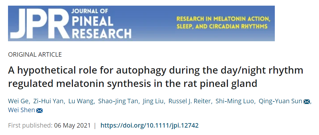 5月6日,国际著名期刊《Journal of Pineal Research》(一区,IF=14.528)在线发表了beat365亚洲体育官方网站沈伟教授课题组完成的题为“A hypothetical role for autophagy during the day/night rhythm regulated melatonin synthesis in the rat pineal gland”的研究论文,首次揭示了自噬调控褪黑素合成的潜在分子机制。