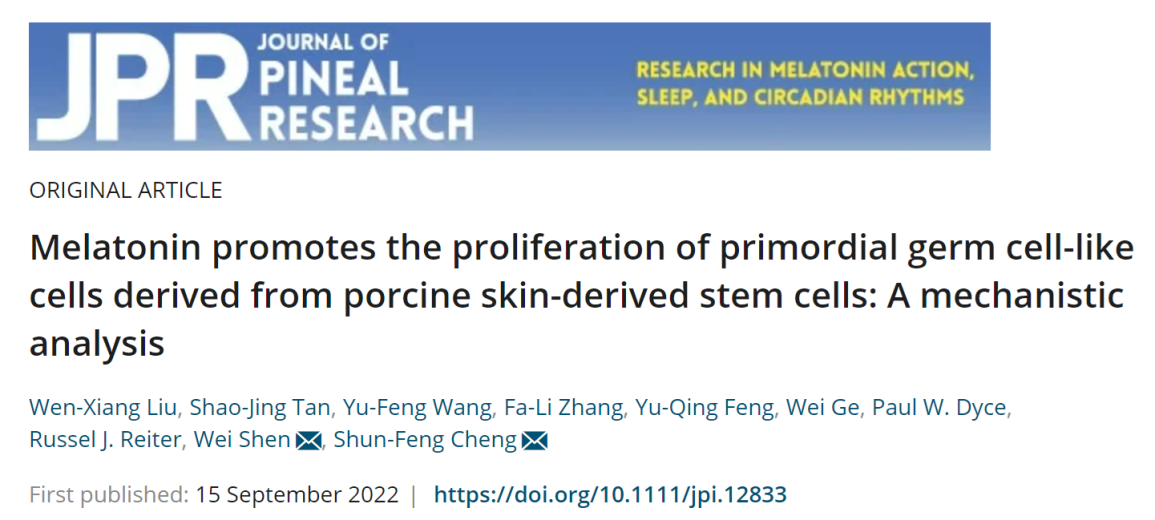 近日,beat365亚洲体育官方网站生猪种业创新团队程顺峰教授研究组在中科院一区、TOP期刊《Journal of Pineal Research》(IF=12.081)上发表研究论文“Melatonin promotes the proliferation of primordial germ cell-like cells derived from porcine skin-derived stem cells: A mechanistic analysis”。该论文首次揭示了褪黑激素促进猪皮肤来源干细胞(skin-derived stem cells,SDSCs)体外分化的原始生殖细胞样细胞(primordial germ cell-like cells,PGCLCs)增殖的分子机制。