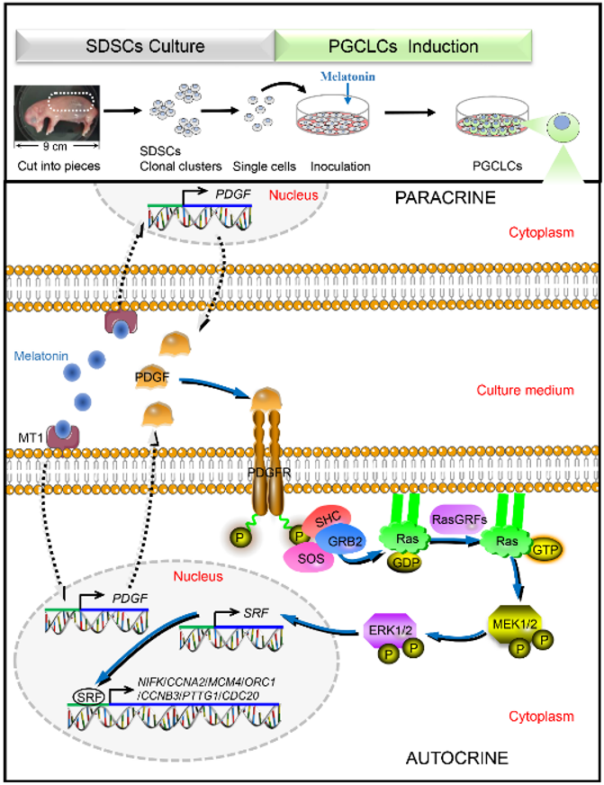 我国具有悠久的养猪历史,且拥有全球1/3的地方猪种质资源。但近年来,我国地方猪种养殖量急剧减少,部分地方品种几近灭绝,导致地方猪种遗传资源多样性遭受严重破坏,优质基因不断流失。目前猪遗传资源保护的一些方法,如原位保存、精液冷冻保存、DNA文库保存和体细胞库保存等,均具有一定的局限性。干细胞是一类可以自我更新并具有多向分化潜能的细胞群体,它不仅能分化成不同类型的细胞,还可以通过有丝分裂维持自身的遗传稳定性。无论是从现有扩群的技术途径还是从未来发展前景看,干细胞保种具有其它技术保重不可替代的优势。公司beat365亚洲体育官方网站生猪种业创新团队程顺峰教授研究组在构建地方良种猪干细胞种质资源库的基础上,进一步对猪干细胞进行创新应用。研究组以体外分离纯化的猪皮肤来源干细胞(SDSCs)为实验材料,研究了其体外转分化为原始生殖细胞样细胞(PGCLCs)的分子调控机制,发现褪黑激素(MLT)能显著促进分化的PGCLCs体外增殖。该研究证实,SDSCs转分化PGCLCs过程中,MLT经褪黑素受体1(MT1)介导可显著提高血小板衍生生长因子(PDGF)的转录和翻译水平,PDGF通过自分泌和旁分泌作用途径激活PDGF受体,随后刺激Ras并进一步激活转录因子血清反应因子(SRF),靶向调控细胞周期相关基因的表达,从而促进PGCLCs增殖。该研究系统地阐明了MLT通过MT1介导的MAPK信号通路在PGCLCs体外增殖中的作用途径和分子机制。