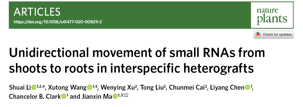 Unidirectional movement of small RNAs from shoots to roots in interspecific heterografts. Nature Plants, 2021, 7:50–59, https://doi.org/10.1038/s41477-020-00829-2