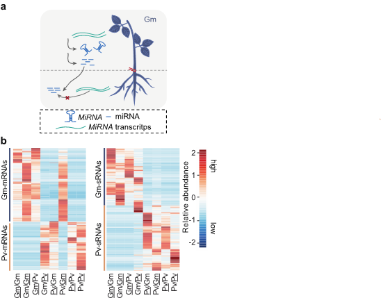 (a)miRNA移动和积累模式图;(b)可移动mRNA和sRNA在受体组织中的表达量;Gm为大豆组织。Pv为菜豆组织。