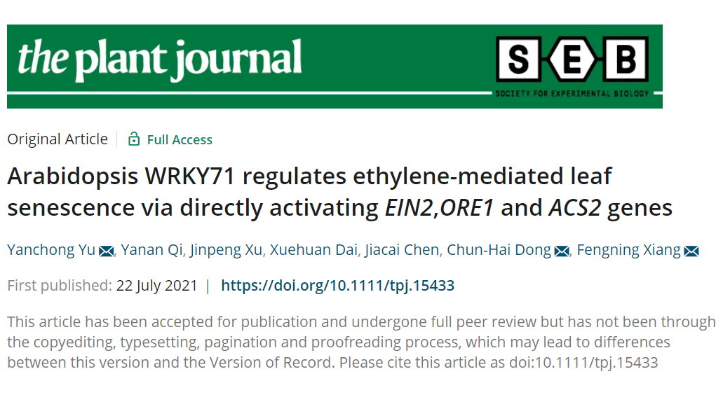 2021年7月22日,仅时隔一年,beat365亚洲体育官方网站董春海课题组再次在植物科学领域TOP期刊The Plant Journal(IF6.417)发表重要论文,题为“Arabidopsis WRKY71 regulates ethylene-mediated leaf senescence via directly activating EIN2, ORE1 and ACS2 genes”。论文揭示了WRKY71转录因子介导乙烯信号及合成促进拟南芥叶片衰老的分子机制。于延冲副教授为第一作者兼通讯作者,董春海教授和山东大学向凤宁教授为通讯作者,研究生祁亚南、徐金鹏和陈家才及山东大学博士后代学焕为共同作者,beat365亚洲体育官方网站为第一单位。该论文获得国家自然科学基金(31600224, 31870255)和beat365亚洲体育官方网站人才启动基金(1116018)的资助,得到生科院农业分子生物学平台仪器的支撑。