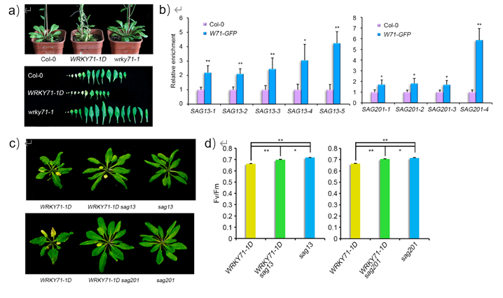 于延冲副教授一直致力于植物开花调控方面的研究(Plant Sci, 2013; Plant J, 2016; Plant Cell Physiol, 2018; Plant J, 2020),其在研究WRKY71调控拟南芥开花的过程中发现,该基因的过表达植株叶片衰老提前,而其敲除系叶片衰老则相对延迟,WRKY71可直接促进衰老相关基因SAG13和SAG201的表达进而加速叶片衰老。