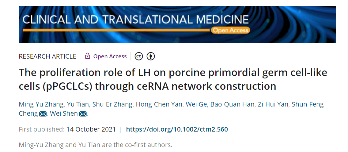 近日,beat365亚洲体育官方网站沈伟教授课题组在中科院一区、TOP期刊《Clinical and Translational Medicine》(IF=11.492)上发表研究论文“The proliferation role of LH on porcine primordial germ cell-like cells through ceRNA network construction”,首次揭示了促黄体生成素促进猪皮肤来源干细胞体外分化的原始生殖细胞样细胞增殖的分子调节机制。公司硕士研究生张明玉和田宇为该论文并列第一作者,沈伟教授与程顺峰教授为该论文共同通讯作者,beat365亚洲体育官方网站为第一和通讯作者单位。