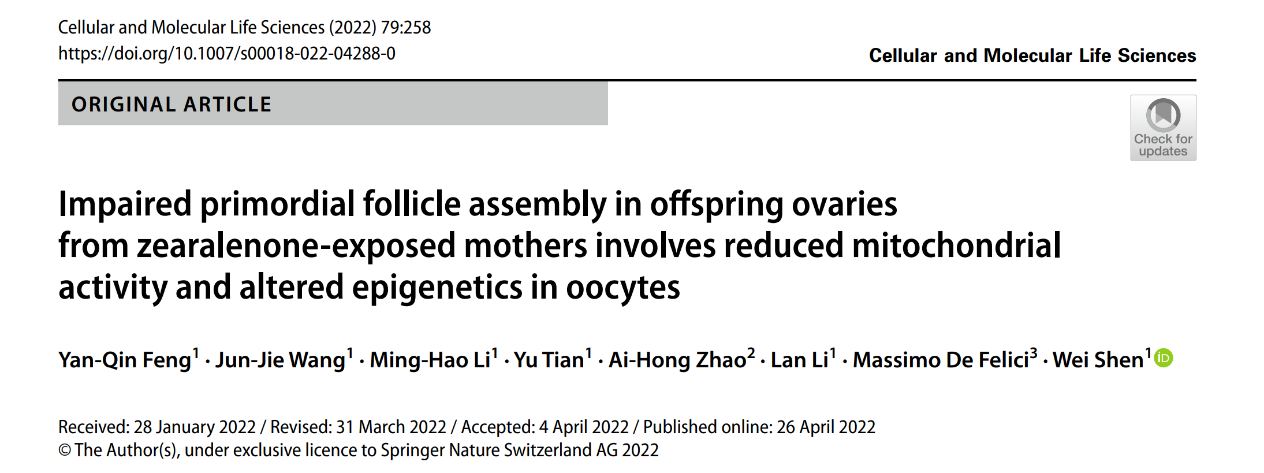 近日,beat365亚洲体育官方网站沈伟教授课题组在国际重要期刊《Cellular and Molecular Life Sciences》(IF=9.261)上发表研究性论文“Impaired primordial follicle assembly in offspring ovaries from zearalenone‑exposed mothers involves reduced mitochondrial activity and altered epigenetics in oocytes”,该论文在单细胞分辨率水平上揭示了母体围产期暴露霉菌毒素抑制仔鼠原始卵泡形成的新机制。
