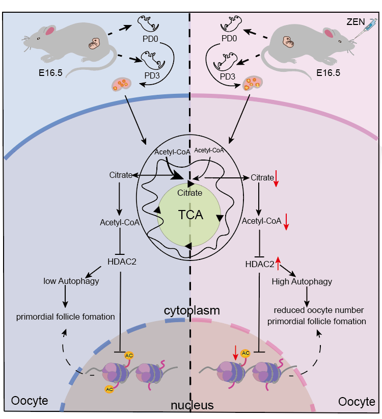 为了探究ZEN暴露毒害原始卵泡形成的分子机制,沈伟课题组从母鼠怀孕16.5天对其灌服ZEN,持续至仔鼠出生后。在小鼠出生后当天及第三天,收集新生鼠卵巢进行单细胞转录组测序,并针对卵母细胞进行深入分析。结果发现,ZEN暴露能够通过影响线粒体活性进一步造成卵母细胞自噬及卵巢内组蛋白乙酰化水平的改变,这可能是ZEN暴露妊娠期母鼠跨代影响后代原始卵泡形成的一条重要途径。此外,该研究还对ZEN处理组的母鼠进行了辅酶Q10补充,通过提高线粒体活性,缓解了ZEN对原始卵泡形成的毒害作用。研究从多角度全方面解析了ZEN暴露影响原始卵泡形成的分子机制,揭示了围产期母鼠持续暴露ZEN能够通过影响仔鼠卵母细胞线粒体活性抑制其原始卵泡形成,为有效缓解ZEN的毒性提供了重要理论依据。