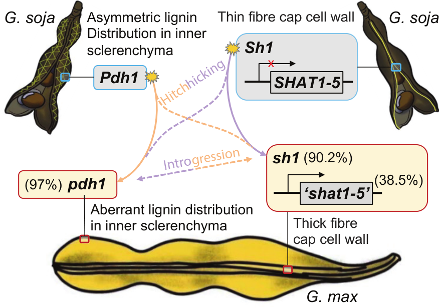 裂荚是野生大豆散播种子的重要方式,然而在现代农业栽培过程中,裂荚严重影响大豆的产量。为解析大豆裂荚关键调控基因,李帅课题组利用重组自交系对大豆裂荚调控基因进行精细定位,并克隆了位于16号染色体的裂荚调控基因Sh1和Pdh1。Sh1基因中碱基“G”向“A”的突变,同时加上9个碱基的缺失,引起Sh1向sh1的转变,使植株由裂荚向抗裂荚改变。Pdh1基因中碱基“A”向“T”的突变,导致Pdh1向pdh1的转变,使植株由裂荚向抗裂荚改变。Sh1编码一个C2H2锌指蛋白转录因子,通过抑制SHAT1-5基因的表达,从而减少豆荚缝脱落层纤维帽细胞的次生壁厚度,促进豆荚腹缝线开裂。Pdh1编码一种dirigent蛋白,它能协调木质素在内层韧皮部的不对称分布,使豆荚壁产生扭转,从而促进裂荚。对代表性大豆种质中的数量性状基因座图谱、全基因组关联研究和等位基因分布的整合分析表明,sh1和pdh1这两个基因是这一驯化性状的主要调节因子。Sh1和Pdh1所在基因组区域在长期驯化过程中受到筛选。现代大豆栽培种中sh1基因型占93.1%,pdh1基因型占86.5%。相关研究成果已在Nature Communications期刊发表(2024, 15:7588),beat365亚洲体育官方网站李帅教授为第一兼通讯作者,美国普渡大学马渐新教授(公司农学系1989级员工)为共同通讯作者。