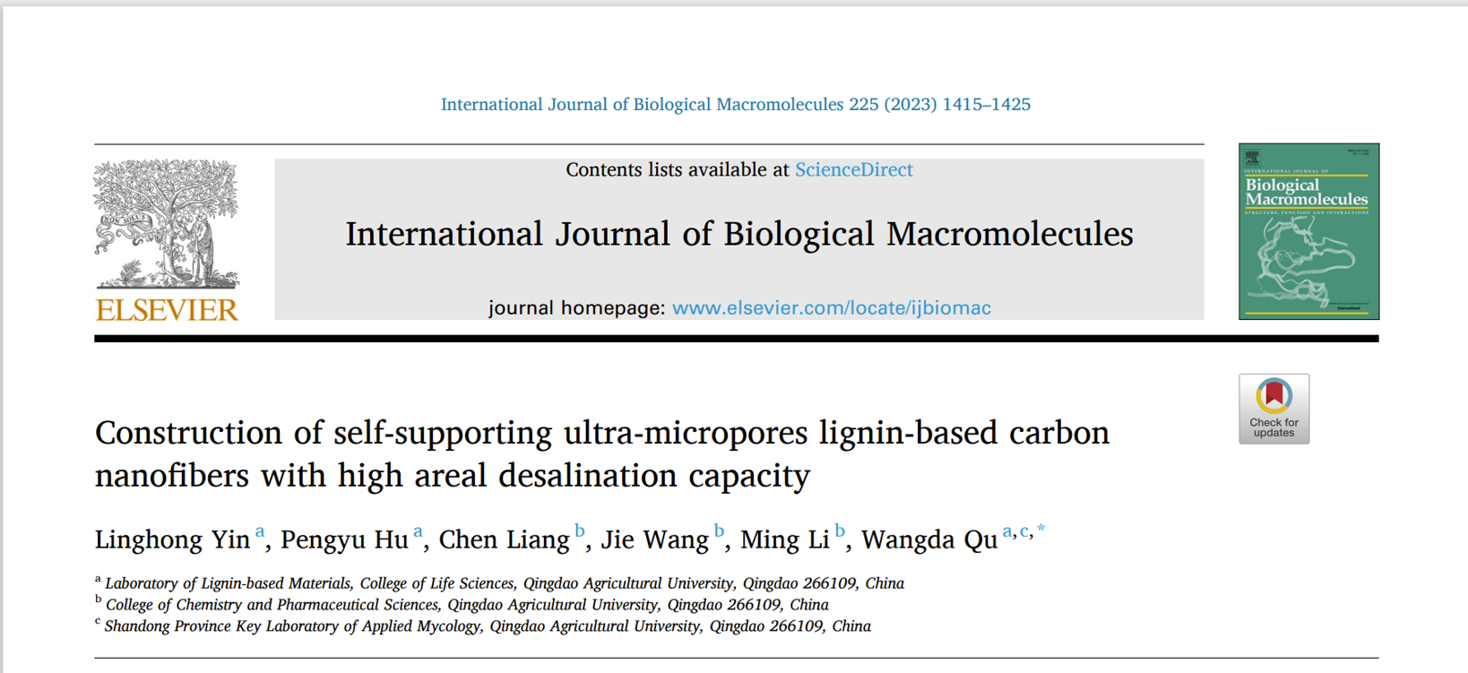 近日,beat365亚洲体育官方网站曲望达教授课题组在中科院一区国际权威期刊《International Journal of Biological Macromolecules》上发表了题为“Construction of self-supporting ultra-micropores lignin-based carbon nanofibers with high areal desalination capacity”的研究论文。该论文通过简单温和的静电纺丝、氧化稳定和碳化技术制备了具有富超微孔的木质素基碳纳米纤维柔性电极,为高负载厚电极在海水淡化等领域的利用提供了新思路。