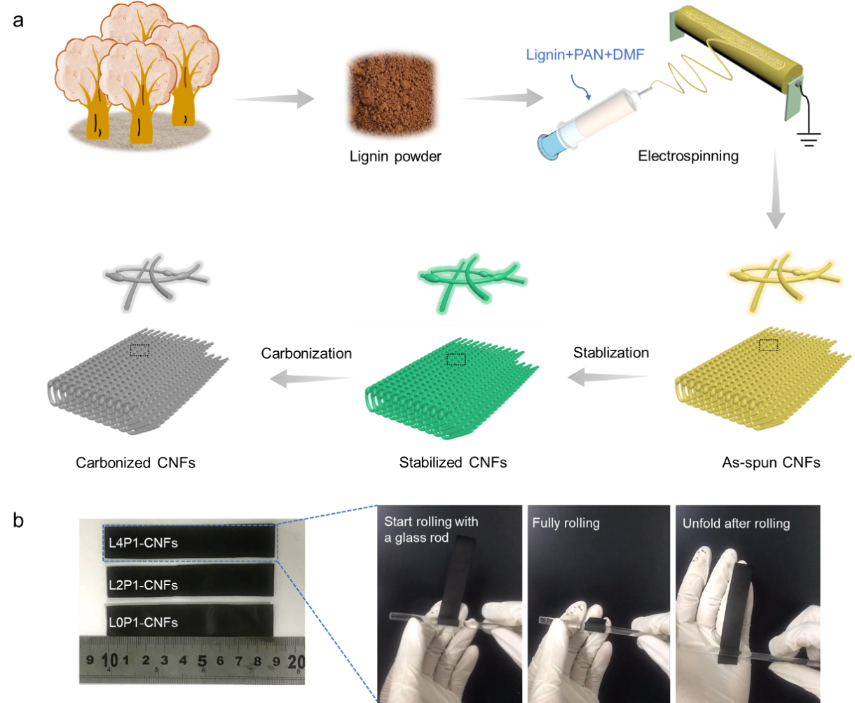木质素基碳纳米纤维的合成工艺及碳化后样品的柔韧性展示图