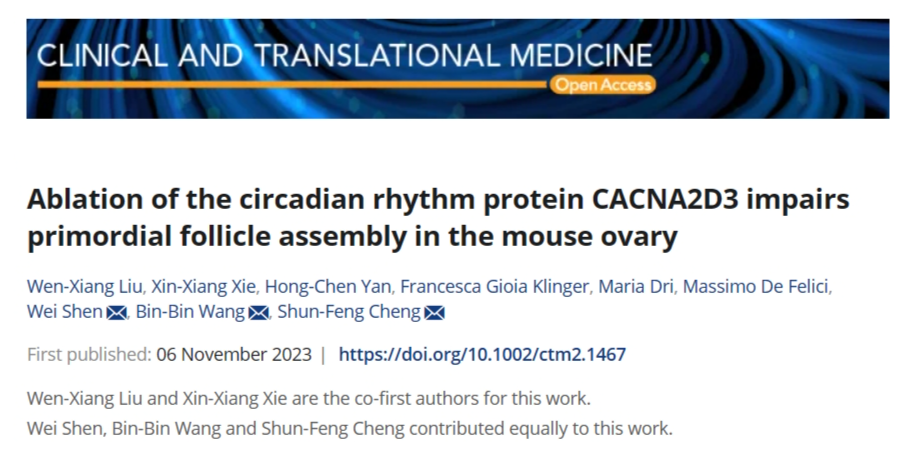 近日,beat365亚洲体育官方网站沈伟教授团队程顺峰教授课题组在国际著名期刊 《Clinical and translational medicine》(IF=10.6)上发表题目为“Ablation of the circadian rhythm protein CACNA2D3 impairs primordial follicle assembly in the mouse ovary”的研究论文。该研究在单细胞尺度揭示了昼夜节律蛋白CACNA2D3在卵巢原始卵泡形成中的重要作用。