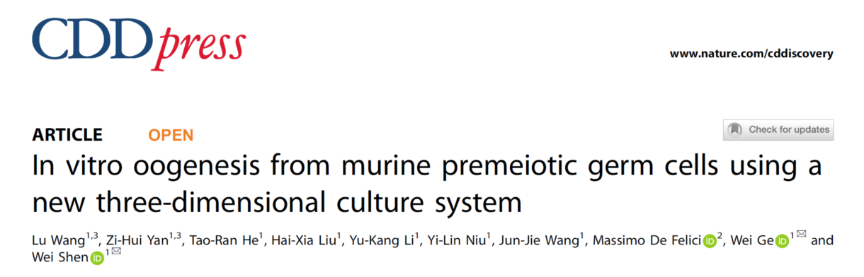 近日,beat365亚洲体育官方网站沈伟教授课题组在细胞生物学权威杂志《Cell Death & Disease》在线发表了题目为“In vitro oogenesis from murine premeiotic germ cells using a new three-dimensional culture system”的研究论文。