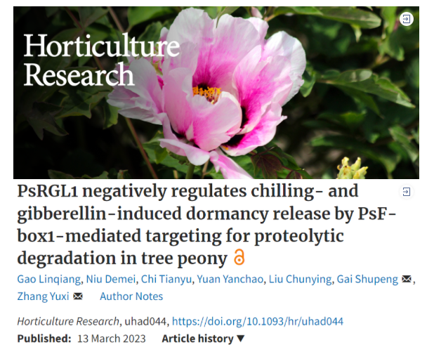 近日,beat365亚洲体育官方网站盖树鹏团队在农林科学领域一区、Top期刊《Horticulture Research》上发表了题为“PsRGL1 negatively regulates chilling- and gibberellin-induced dormancy release by PsF-box1-mediated targeting for proteolytic degradation in tree peony”的研究成果。该研究从GA信号调控的角度,解析了GA信号的负调控因子参与牡丹芽休眠解除的分子机制。