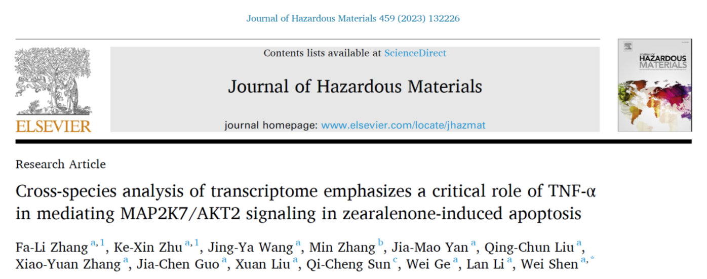 近日,beat365亚洲体育官方网站生猪种业创新团队沈伟教授课题组在生猪健康养殖及霉菌毒素防控方面取得重要进展,相关成果以“Cross-species analysis of transcriptome emphasizes a critical role of TNF-α in mediating MAP2K7/AKT2 signaling in zearalenone-induced apoptosis”为题,在线发表于《Journal of Hazardous Materials》(一区top期刊,IF=13.6)杂志上。