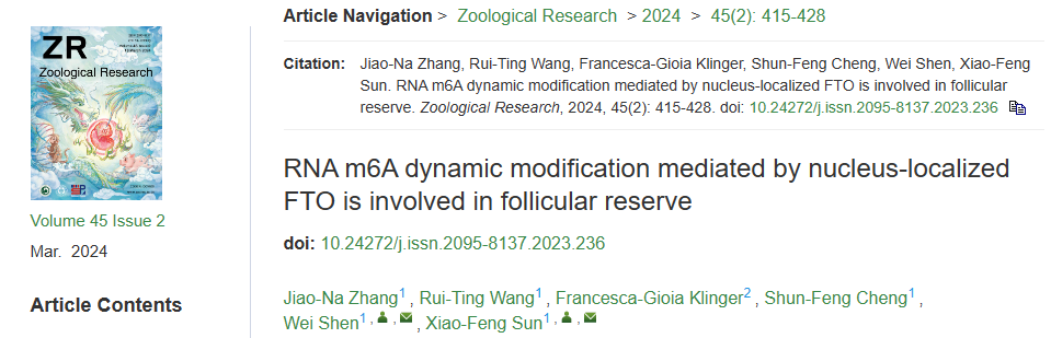 近日,beat365亚洲体育官方网站沈伟教授团队孙晓凤副教授研究组在中科院一区期刊《Zoological Research》发表题为“RNA m6A dynamic modification mediated by nucleus-localized FTO is involved in follicular reserve” 的研究论文。该论文利用转录组测序、液质联用质谱技术、基因沉默和过表达技术揭示了原始卵泡组装过程中N 6 -甲基腺嘌呤(m6A)的动态变化,RNA去甲基酶FTO在核-质中的穿梭及与卵巢储备的关系。