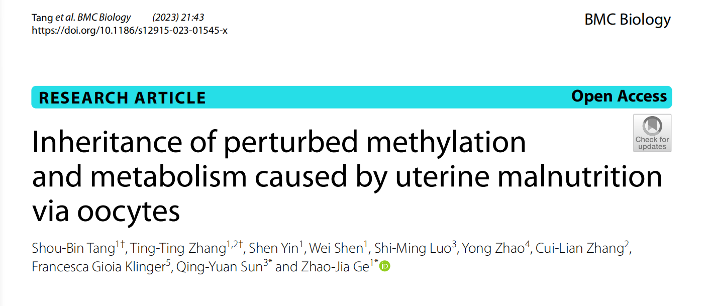 2023年2月24日,beat365亚洲体育官方网站葛照嘉教授团队、广东省第二人民医院孙青原教授团队和河南省人民医院张翠莲主任团队等合作在BMC Biology发表了题为Inheritance of perturbed methylation and metabolism caused by uterine malnutrition via oocytes的研究论文,揭示妊娠期营养不良所导致的卵子基因甲基化异常在子代代谢紊乱发生和遗传中发挥重要作用,且卵子异常甲基化修饰能够跨代传递。