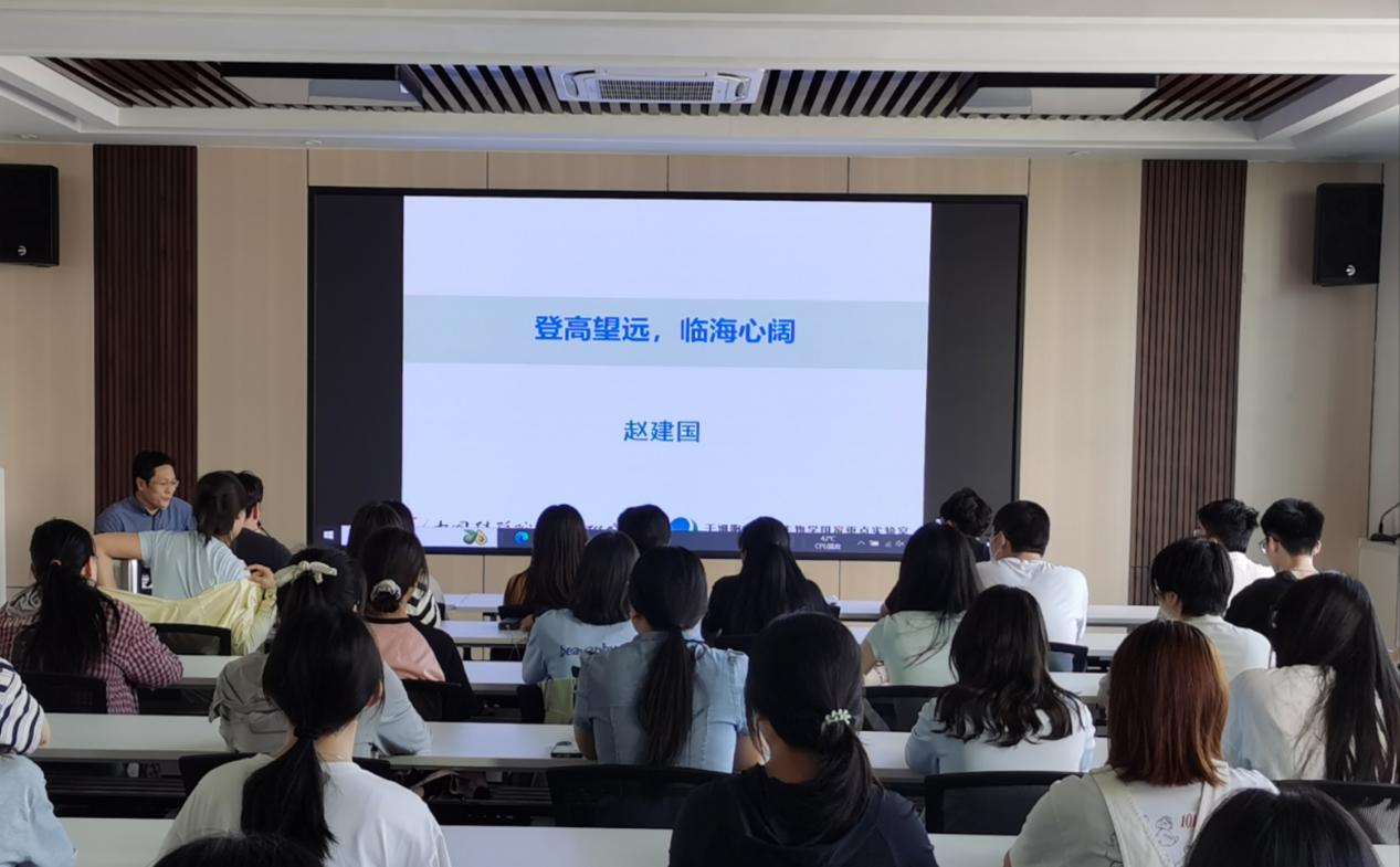 赵建国以“登高望远,临海心阔”为主题,重点围绕自身科研经历、科研方向、科研经验、科研自律四个方面进行介绍。他以自己在科研领域的经历与成果为例,分享了科研经验,指出同学在选择科研方向时,不仅需要考虑兴趣与专业匹配度,也应注意领域发展潜力和自我未来规划。他强调科研工作要学会合理利用时间与资源,提高自律性。