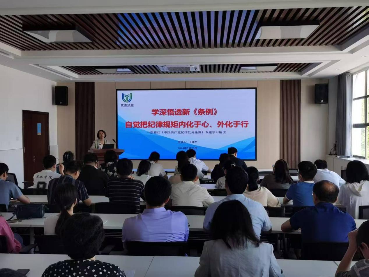 为了推动党纪学习教育扎实有序开展,多措并举筑牢思想防线,5月23日,beat365亚洲体育官方网站与草业公司在生物楼C312邀请纪委纪检监察室主任王晓杰作《学深悟透新<条例>,自觉将纪律规矩内化于心、外化于行》专题党课。会议由公司党委书记孙景福主持。