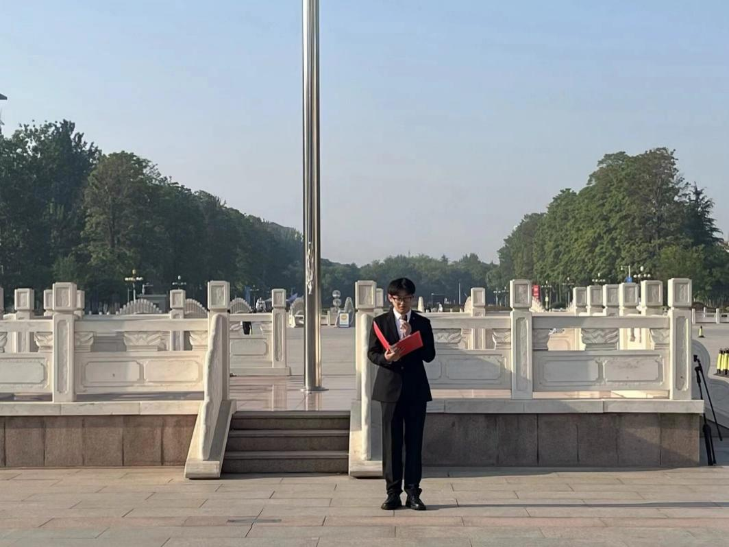 升旗仪式开始,国旗护卫队队员迈着铿锵有力的步伐,护送着国旗走向升旗台,伴随着激昂雄壮的国歌声,鲜艳的五星红旗迎着朝阳冉冉升起,全体师生肃穆站立、行注目礼,向国旗致以最崇高的敬意。升旗礼毕,员工代表郑学通作国旗下的讲话。他号召广大青年要继承、发扬五四精神,要勇于追求青春理想,勇于释放青春活力,保持积极向上的态度,为实现中华民族伟大复兴、国家富强贡献自己的力量。