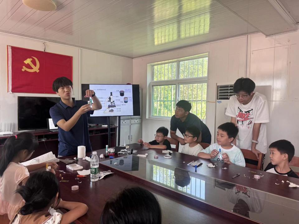 时值暑假,村里不少孩子的父母在外务工。为了让孩子们度过一个安全、充实、快乐的假期,实践团队员们精心策划了一系列陪伴活动。除了耐心辅导暑期作业、组织趣味阅读分享,团队成员们还将专业知识转化为趣味实践:带领孩子们利用简易材料组装显微镜,一起观察植物叶片的微观世界,激发科学兴趣;手把手教授心肺复苏、伤口包扎等实用急救技能,提升孩子们的安全自护能力;拔河、跳大绳等趣味游戏更是让村委会前的广场充满了欢声笑语。