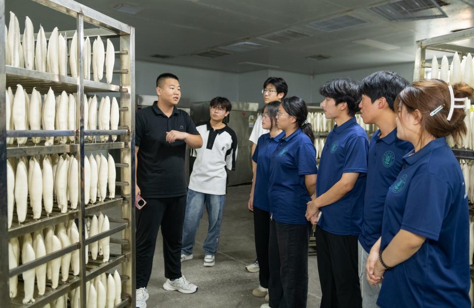 在恩城镇,实践团首先探访了当地特色非遗产品——签子馒头的生产企业。热气腾腾的车间里,负责人向队员们详细介绍了签子馒头独特的手工制作技艺、发展历程以及市场现状。“这门老手艺承载着乡愁,但也面临创新和销路拓展的挑战。”负责人坦言。团队成员们边观察边记录,结合生物技术在微生物方面对产品影响与企业人员就产品开发行了热烈讨论,使得队员们更加深刻地认识到自身专业与产业技术间的联系。